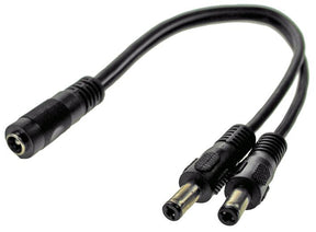 A DC extension splitter cable with a 2.1mm DC input socket that terminates with two 2.1mm DC connectors. The splitter enables a single output to be split thus allowing a number of units to be powered from a single source.