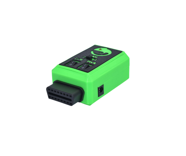 There is a power switch and power indication LED, a separate ignition switch, and a CAN resistor selector switch between 0R and 120R CAN resistors across the CAN signals.